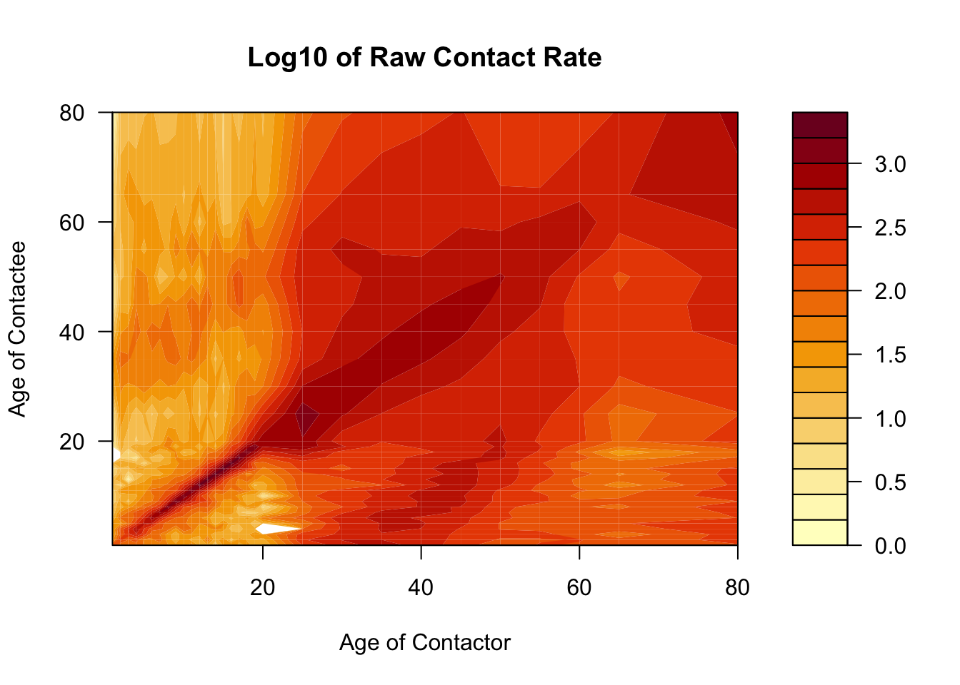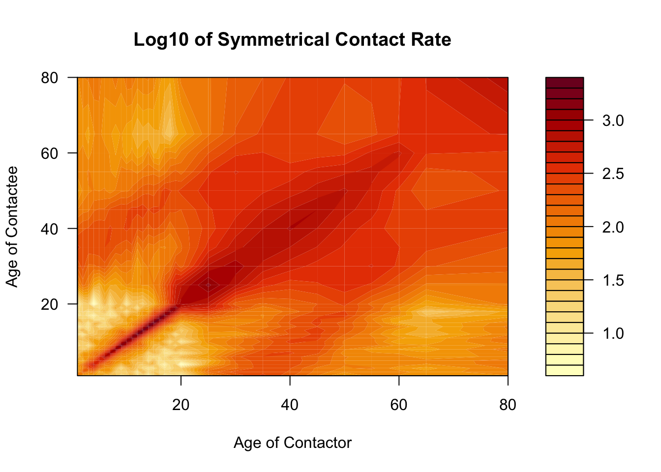 Here we’ll use the filled.contour function to visualize the contact matrix, to show you an alternative way of visualizing contact matrices. Notices that we are using the raw matrix object, not a long dataframe, as previously.