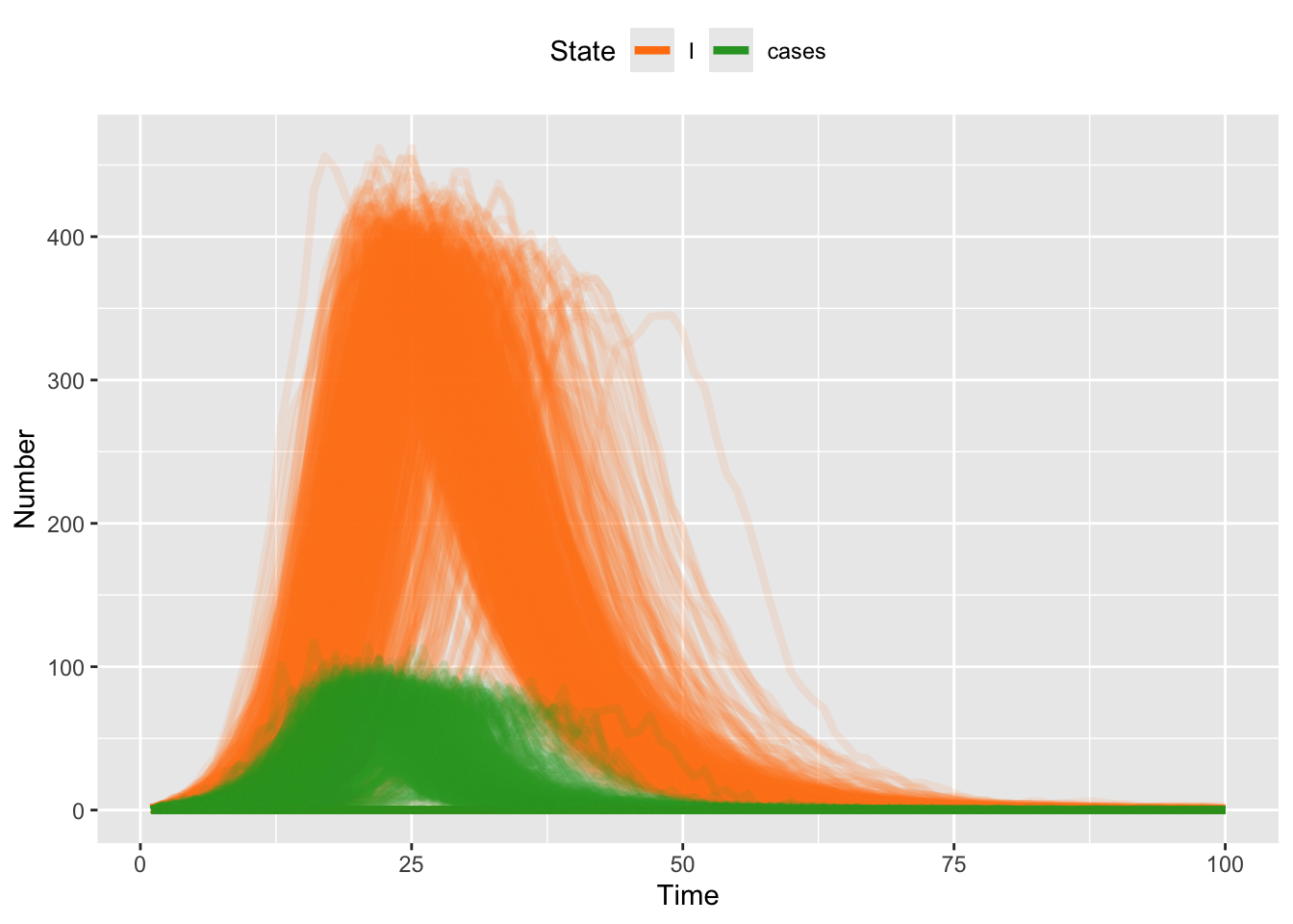 In the last section, we saw that by moving from continuous time to discrete time steps, we limit the complexity (the number of stochastic evaluations scales with time and the number of states, instead of population size and the number of states). You may have also noticed that the individual steps in the Tau Leaping algorithm can be modeled as Poisson or Binomial random variables. Combining these two gives us another common algorithm for stochastic simulation, the Chain Binomial model. Here, we simplify further and use a time step that is equal to the infectious generation period; e.g. 2 weeks for measles, or 1 week for flu. If we assume that time progresses in discrete, non-overlapping generations, then those that get infected at the start of one time step, recover at the end of that time step. This simplification means that we only have to model the infection process as stochastic, and the recovery process at the end of the time step is now deterministic. This is obviously unrealistic, but makes the model much simpler for formal statistical model fitting using likelihood and Bayesian methods. So while it is imperfect, it remains as a common method for “first-pass” analyses.