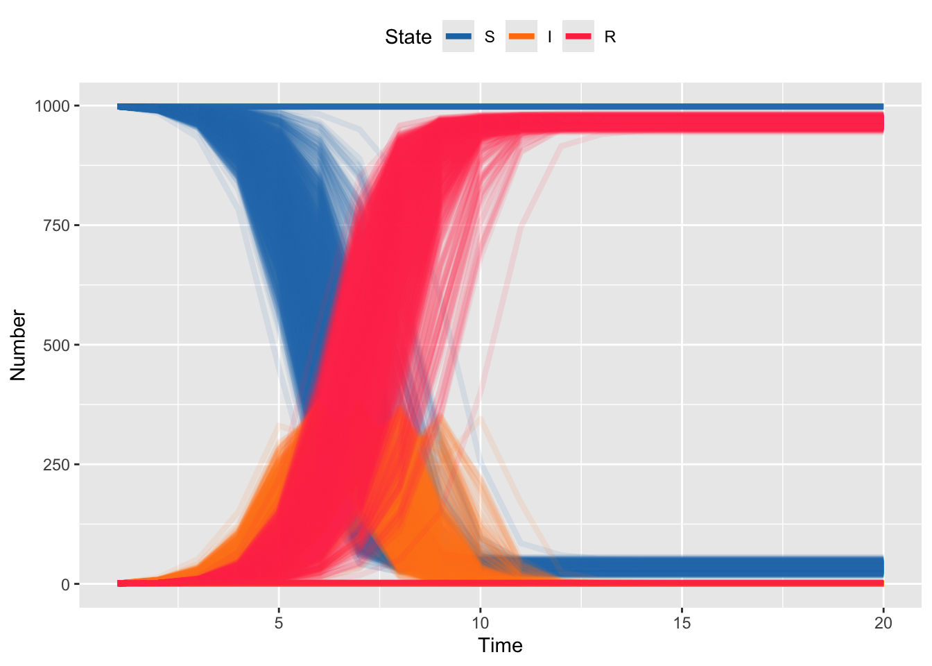 }Note in the code above that we’re taking Poisson random draws, but there is some code commented out that uses binomial draws. The former is exact for the theory, but it can give rise to settings where the transitions “get ahead of themselves” and you have more recoveries than infecteds, or more infections than susceptibles, which drives the states negative. We can fix this by checking if the states go negative and disallowing this … which is inelegant. We can also fix this by using binomial draws, which are naturally constrained not to go negative. The reason we don’t automatically start with binomial draws is that they are computationally slower than Poisson draws (this occurs because the binomial distribution includes some combinatorial terms that are slow to compute). As computers have gotten faster, this is less of an issue.