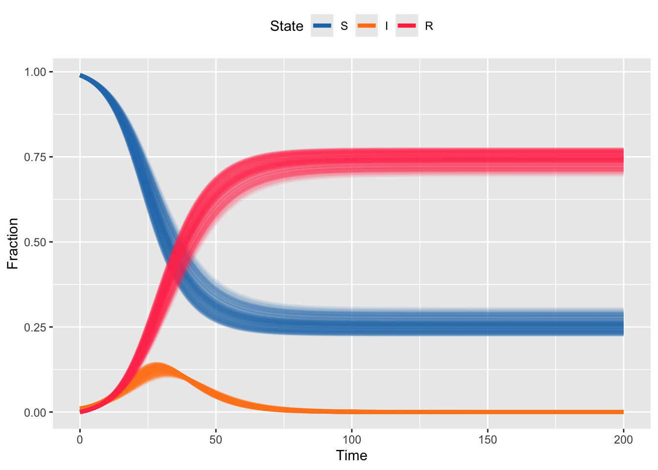 Now, perhaps we used the tools from R-session 3 to estimate \(R_0\) and we think a reasonable \(95\%\) confidence interval for \(R_0\) is \((1.7,1.9)\). If we’re quite certain the duration of infection is 6 days, then that means our corresponding confidence interval on the transmission rate is \((.283,.317)\). An entirely reasonable way to represent this uncertainty in the estimate of the transmission rate is to generate many random draws from within the confidence interval for the transmission rate and examine the resulting epidemic curves. For this we can modify the code above with a loop that does this multiple times.